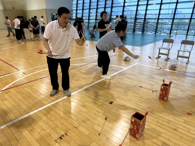 院长罗洎宣布运动会开始。本次趣味运动会精心设置7个特色项目,兼顾竞技性与趣味性,覆盖个人能力与团队协作。“百发百中・定点投篮”项目中,教职工们站在两分线前专注瞄准,篮球入网的清脆声响不断点燃现场气氛;“优雅一掷・趣味投壶”颇具传统文化韵味,大家屏气凝神调整角度,箭羽入壶时的欢呼此起彼伏;“托球跑”“筷子夹弹珠”“童年记忆・拍打纸片”“一气呵成・乒乓球吹吹乐”四个项目则考验着参与者的平衡感、手眼协调能力与速度,教职工们全神贯注投入比赛,彼此间的加油声、鼓励声不绝于耳;最受期待的“精准投射・套圈获奖”项目现场,摆满饮料、零食、小玩具等奖品,教职工们手持套圈认真瞄准,套中奖品时的惊喜笑容成为现场最动人的画面,更让欢乐氛围达到顶峰。