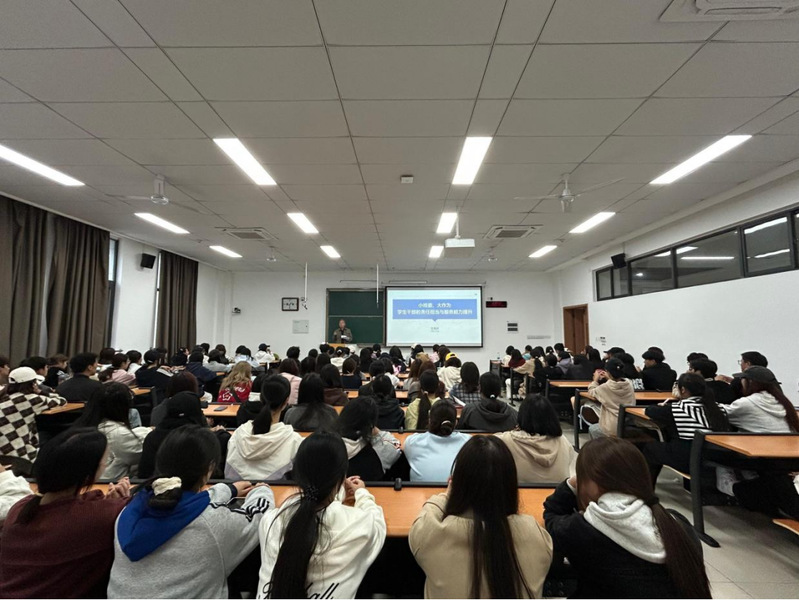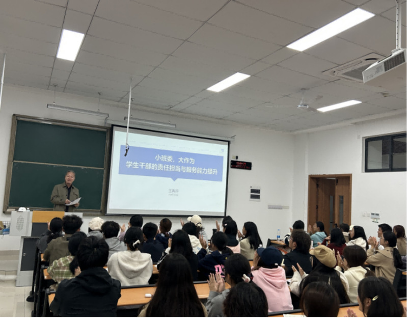 讲座中,王再评围绕“思想引领、基础学习、实践锻炼、支持反馈、文化营造”五大维度,系统阐述了学生干部的职责与成长路径。他结合生动案例,深入浅出地指出:学生干部的本质是“服务者”而非“管理者”,是连接师生的重要“桥梁”,而非被动“传话筒”。他强调,班委既要积极引领优良班风,也需主动反馈同学需求,以“责任心”践行使命,以“服务心”凝聚集体。